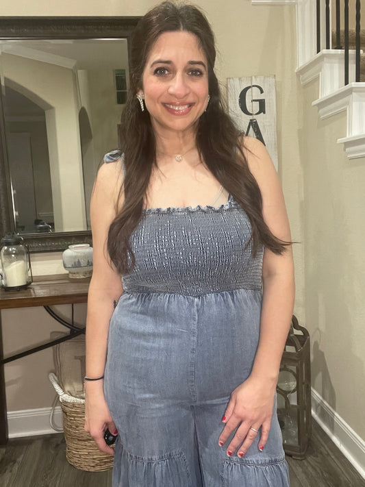 Smocked Tie Chambray Palazzo Wide Pant Jumpsuit