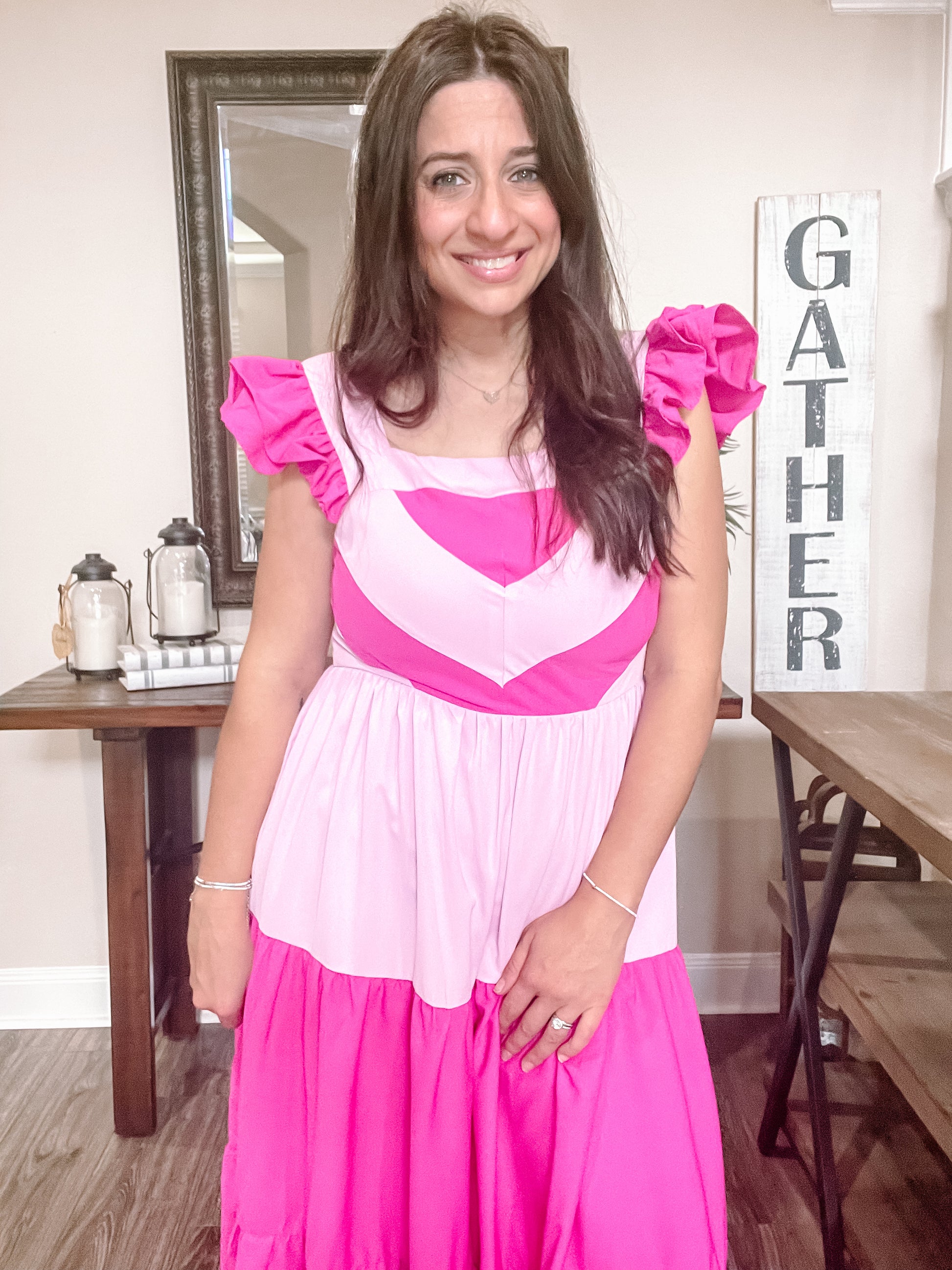Colorblock square neck ruffle sleeve tiered midi dress featuring smocking at back. Invisible zipper closure at back. Lined. Woven. Non-sheer. Lightweight. Fits true to size, I'm in a size medium.