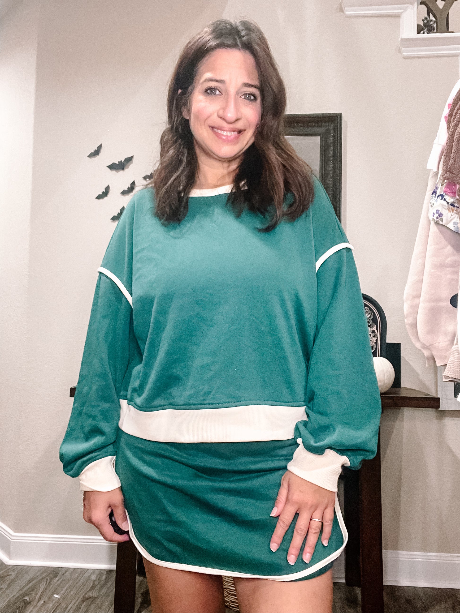 Twill piece green set. Fits true to size, I'm in a size medium.