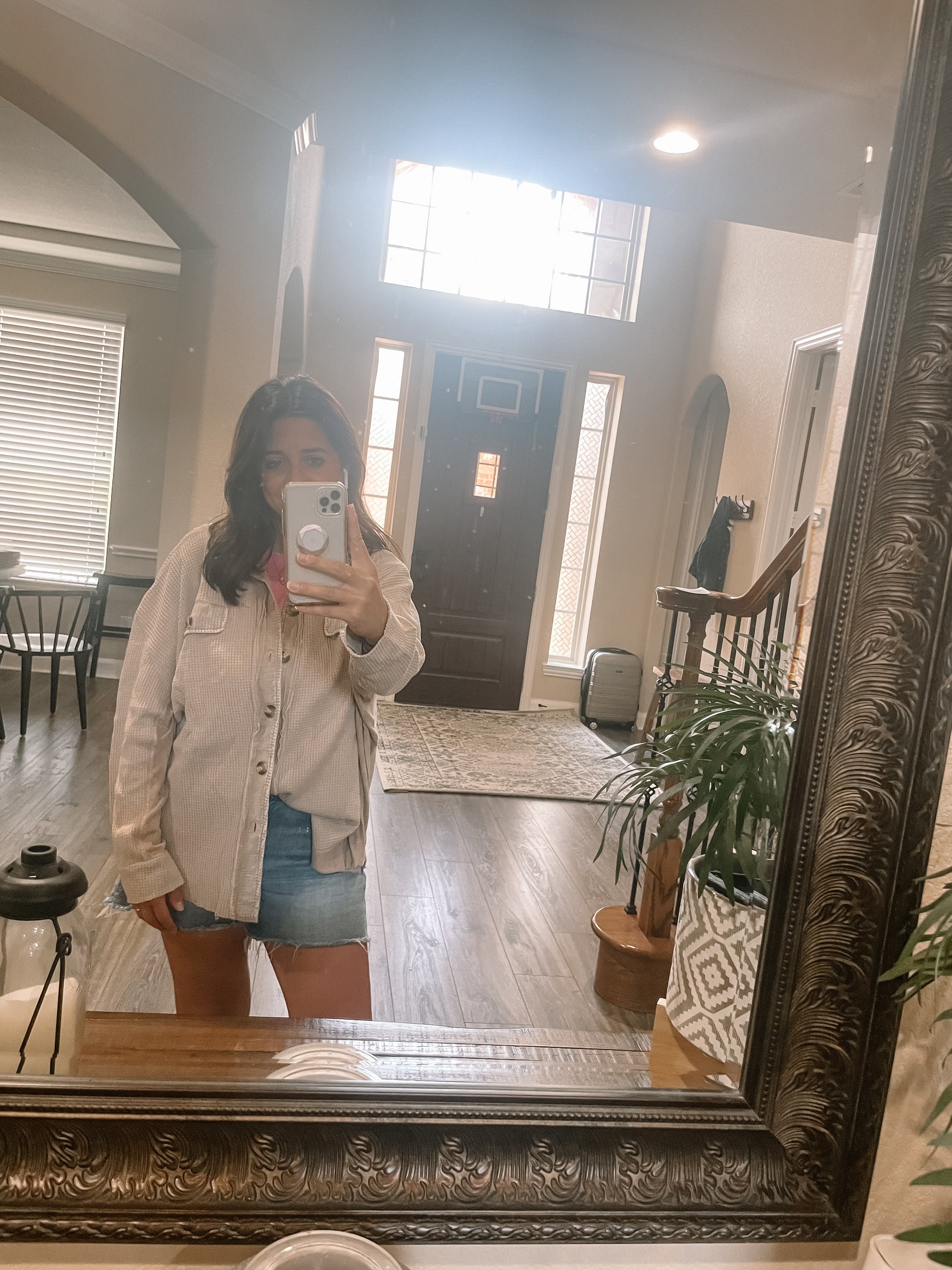 Lightweight jacket featuring a waffle knit fabric, button up front, collared neckline, chest flap pocket, dropped dolman sleeves, raw edge cut design, slouchy silhouette. Wear it alone as a shirt or layer over your favorite top as a cute jacket.